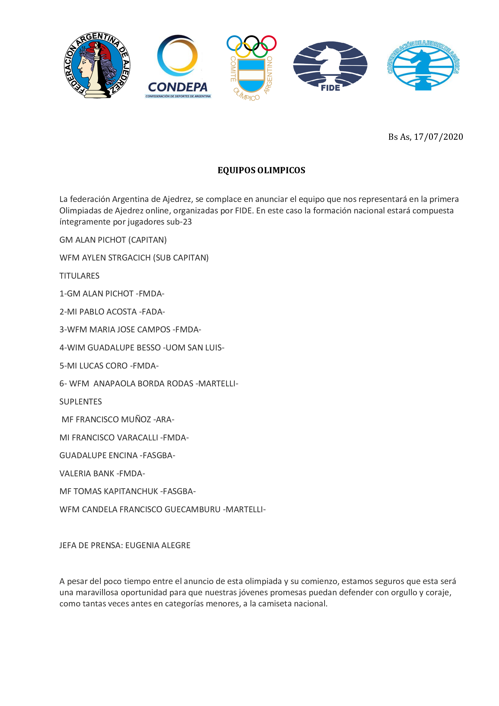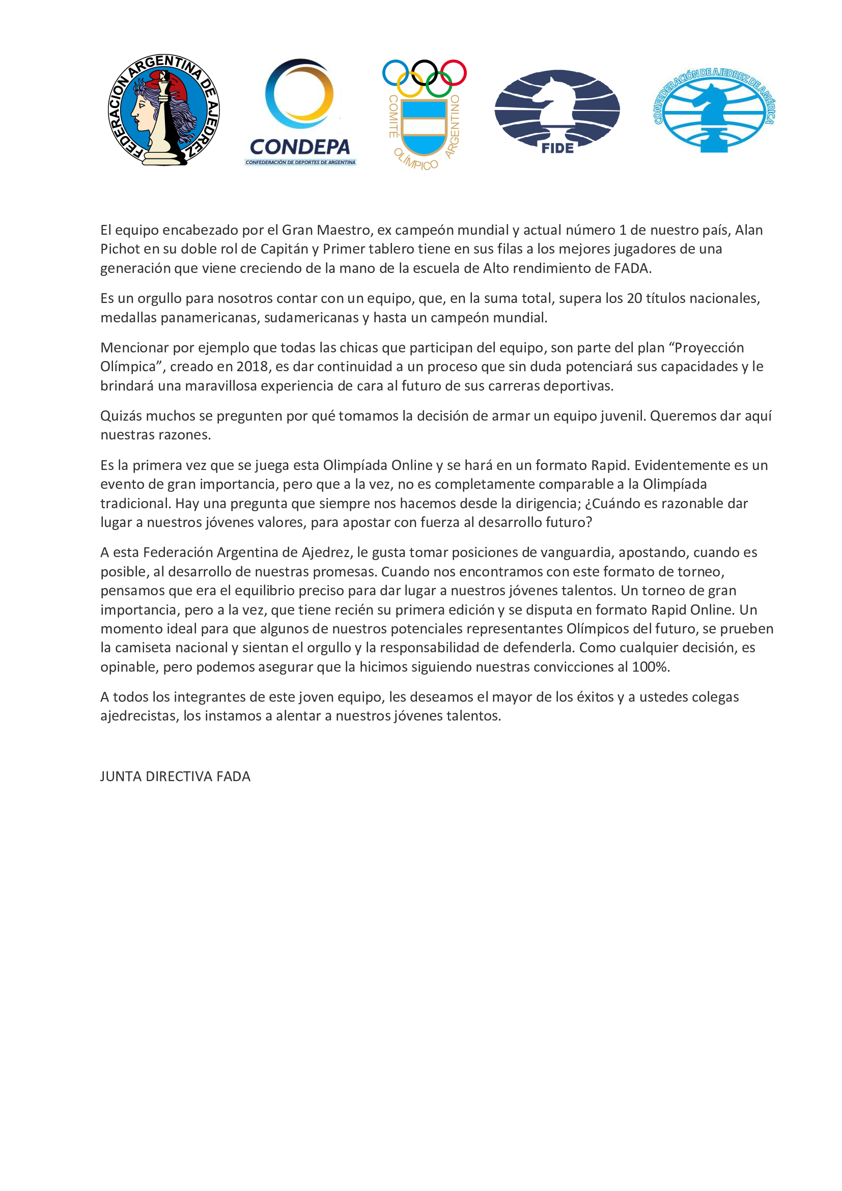Noticias 2020 Con jóvenes promesas Argentina inicia su camino en las olimpiadas online julio 23, 2020 Navegación de entradas Previous: Con buena participación se realizo el Taller online de construcción de acciones participativasNext: El viernes comienzan los clasificatorios sub 2300 Rápido Más historias Noticias 2020 Reglamento 97° Campeonato Argentino Superior Absoluto octubre 30, 2022 Noticias 2020 Finalizó la 44° Olimpiada de Ajedrez Chennai 2022 agosto 9, 2022 Noticias 2020 Pichot gana el premio Olimpia 2021 diciembre 15, 2021