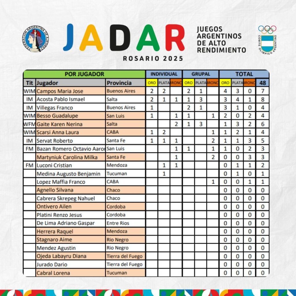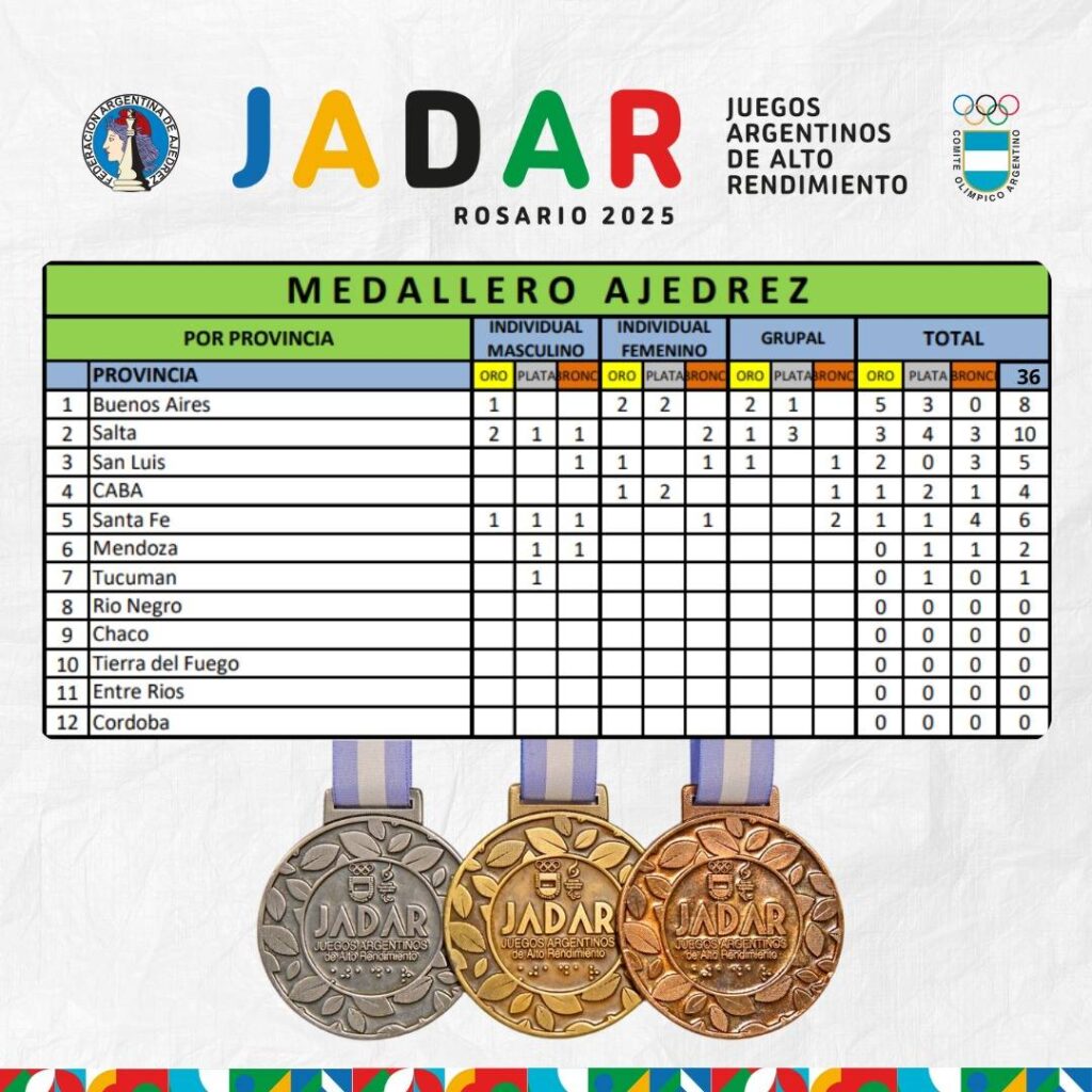 Noticias 2025 Noticias Destacadas Presencia Institucional Medallero Ajedrez JADAR 2025 septiembre 12, 2025 Navegación de entradas Previous: El ajedrez hizo historia en los Juegos JADAR 2025Next: FADA INFORMA Más historias Noticias 2025 Torneos en Argentina En diciembre se juegan las finales argentinas amateurs octubre 24, 2025 Noticias 2025 Noticias Destacadas El ajedrez dijo presente en la celebración del Día Olímpico octubre 20, 2025 Noticias 2025 Noticias Destacadas Argentina presente en la 2ª Olimpiada de Ajedrez para Personas con Discapacidad octubre 20, 2025